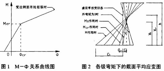 我們知道,彎矩-曲率曲線是根據(jù)試驗(yàn)梁在各級(jí)彎矩下的截面平均應(yīng)變的量測值畫出來的。雙折線M-Φ關(guān)系曲線的假定,實(shí)際上是將各級(jí)彎矩下的截面平均應(yīng)變假定為如圖2所示。其特點(diǎn)是:當(dāng)彎矩小于Mcr時(shí),應(yīng)變圖均相交于一點(diǎn);當(dāng)彎矩大于Mcr時(shí),應(yīng)變圖均相交于較高的另一點(diǎn)。較低的交點(diǎn)處即為開裂以前換算截面形心軸的位置,較高的交點(diǎn)處可以視為開裂以后的換算截面形心軸的位置。