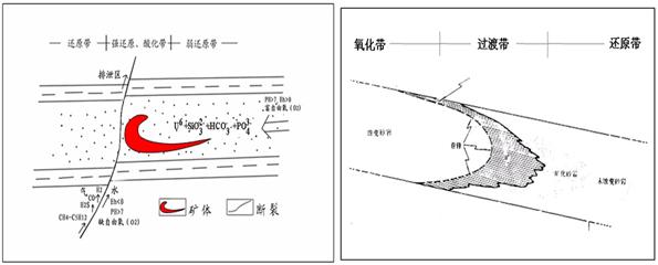 實際勘探結(jié)果表明,東勝鈾礦區(qū)的工業(yè)鈾礦化呈近東西向分布。通過遙感,重力,磁力,地震等多源地學(xué)信息的綜合分析和野外驗證,表明東勝地區(qū)的工業(yè)鈾礦化受近東西向基底斷裂帶控制。該控礦斷裂具有如下特點:①處于隆起與下降斷塊的分界線上;②在深部呈略向東南方向突出的弧形,而在淺部呈略向東北方向突出的弧形;③斷面呈波狀,總體具有壓性(或壓扭性)轉(zhuǎn)張性(或張扭性)的力學(xué)性質(zhì);④具長期活動的特點。經(jīng)對遙感圖像油氣微滲漏信息提取研究,反映出沿斷裂有油氣滲漏現(xiàn)象[6];礦化地段砂巖中的氣液包體,酸解烴等地球化學(xué)研究表明,砂巖中存在大量的油珠及一系列還原氣體[7],且烴類含量在富礦巖層比其它巖層高。這些均表明沿該基底斷裂有油氣運移的跡象,油氣在斷裂附近形成了強還原環(huán)境,導(dǎo)致了鈾的沉淀富集。由于斷裂的活動導(dǎo)致油氣的上升,在斷裂附近形成了有利于鈾沉淀富集的地球化學(xué)障,我們將其命名為構(gòu)造—地球化學(xué)障。它不同于氧化帶前鋒形成的地球化學(xué)障。二者有著不同的控礦模式(圖5)。構(gòu)造—地球化學(xué)障控礦模式強調(diào)了在區(qū)域找礦時,不僅要重視含礦層,而且要重視控礦構(gòu)造,特別是二者的復(fù)合地段。